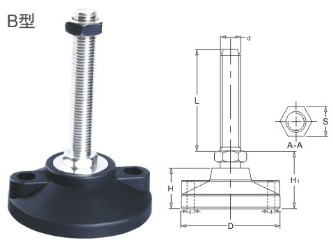 JS.108007 關(guān)節(jié)蹄腳 顏色:黑色 材質(zhì):增強(qiáng)尼龍、碳鋼 用途:適用于小型設(shè)備的水平調(diào)整及減震